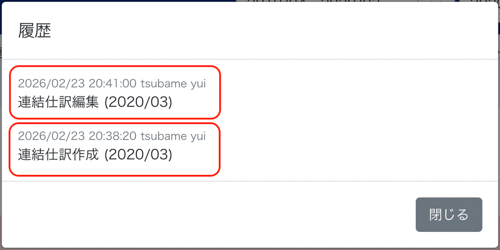 - 作成された仕訳の「履歴」ボタンをクリックします